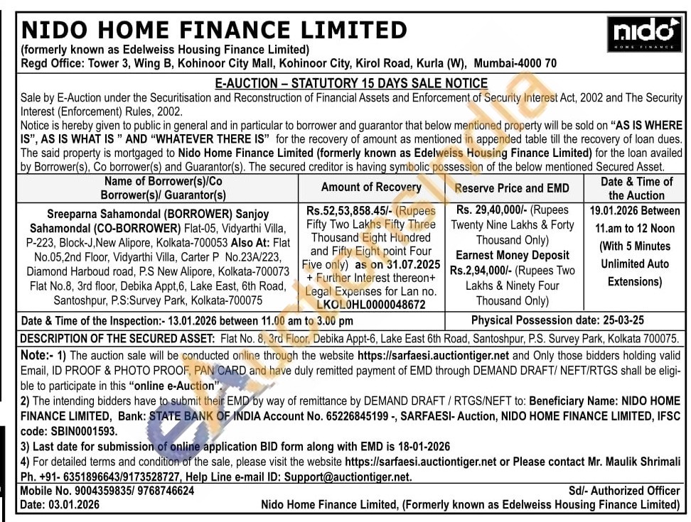 DESCRIPTION OF THE SECURED ASSET: Flat No. 8, 3rd Floor, Debika Appt-6, Lake East 6th Road, Santoshpur, P.S. Survey Park, Kolkata 700075