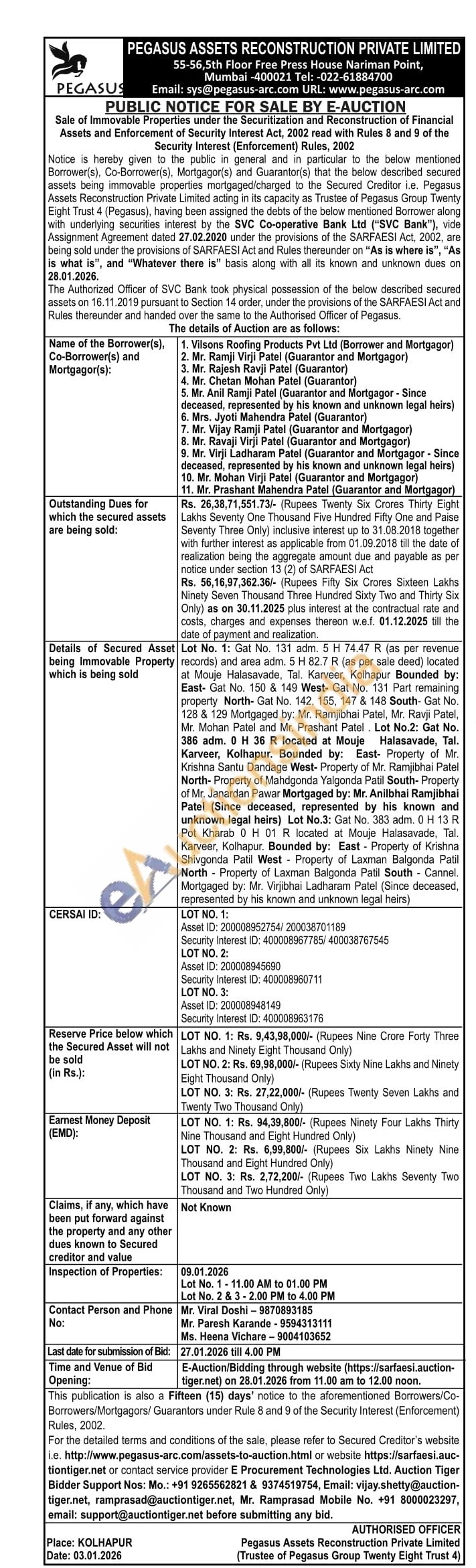 Lot No.2: Gat No. 386 adm. 0 H 36 R located at Mouje Halasavade, Tal. Karveer, Kolhapur. Bounded by: East Property of Mr. Krishna Santu Dandage West-Property of Mr. Ramjibhai Patel North-Property of Mahdgonda Yalgonda Patil South-Property of Mr. Janardan Pawar Mortgaged by: Mr. Anilbhai Ramjibhai Patel (Since deceased, represented by his known and unknown legal heirs)