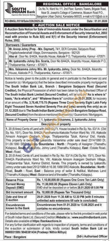 2. 20 (8 Ares) Cents of Land located in Re Sy. No. 53/1A (Old Sy.No. 15/1), Door No. 8/442A Parothamola Ward No. VIII, Alakode Amsom Arangam Desham Village, Thaliparamba Taluk, Kannur District, Kerala. This property is owned by lyakarottu Johny under sale deed 2512/1988 dt 16.08.1988 SRO Alakode. Boundaries: North: Road, South Road, East: Balance prop of seller & Nellikal, Mathews Land (Thanathu Kidappu) West: Balance land of the seller (Thanathu Kidappu