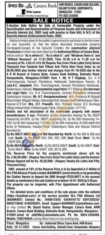 Details and full description of the Immovable property with known encumbrances, if any.: Plantation landed properties bearing Sy No 365/P measuring 3A-05G, Sy No. 366/P measuring 5A, Sy No 358 measuring 1A-10G, Sy No 362 measuring 11A-06G, Sy No 364 measuring 1A-03G within the limits of Hebbasale, Kasaba Hobli, Sakleshpura Taluk and Hassan District bounded by Sy No 365/P, 366/P, 358 and 362 Bounded by: North: Sy No 308 & 309 and road, South: Sy No 366/P, 423, 304, 305, 306, East: Road, West: Sy No 336/P, 305, 307, 308. Sy No 364 Bounded By: North: Sy No 363 & 366/P, South: Sy No 366/P, East: Sy No 366/P, West: Sy No 336/P 305, 307 & 308