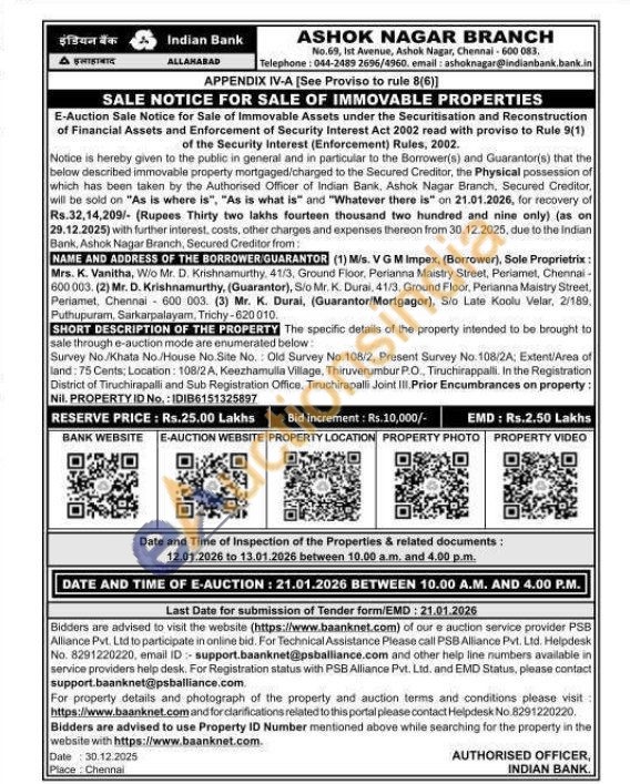 The specific details of the property intended to be brought to sale through e-auction mode are enumerated below: Survey No./Khata No./House No.Site No. Old Survey No. 108/2, Present Survey No. 108/2A; Extent/Area of land: 75 Cents: Location: 108/2A, Keezhamulla Village, Thiruverumbur P.O, Tiruchirappalli. In the Registration District of Tiruchirapalli and Sub Registration Office, Tiruchirapalli Joint III. Prior Encumbrances on property: Nil. PROPERTY ID No.: IDIB6151325897