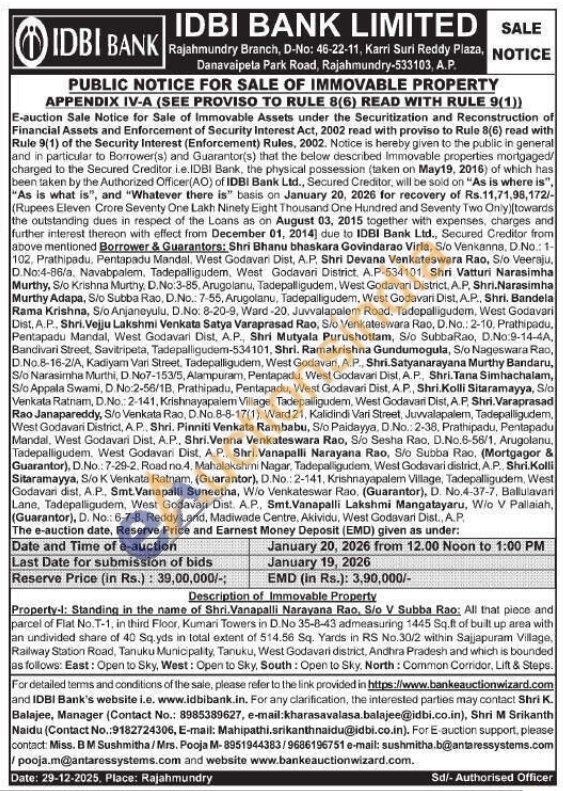 Standing in the name of Shri. Vanapalli Narayana Rao, Sio V Subba Rao: All that piece and parcel of Flat No.T-1, in third Floor, Kumari Towers in D.No 35-8-43 admeasuring 1445 Sq.ft of built up area with an undivided share of 40 Sq.yds in total extent of 514.56 Sq. Yards in RS No.30/2 within Sajjapuram Village, Railway Station Read, Tanuku Municipality, Tanuku, West Godavari district, Andhra Pradesh and which is bounded as follows: East: Open to Sky, West: Open to Sky, South: Open to Sky, North: Common Corridor, Lift & Steps.