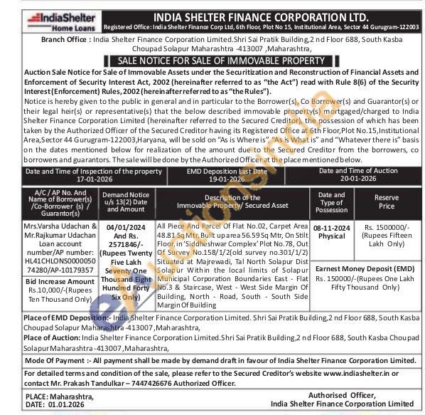 All Piece And Parcel Of Flat No.02, Carpet Area 48.81 Sq Mtr, Built up area 56.59 Sq Mtr, On Stilt Floor, in 'Siddheshwar Complex' Plot No.78, Out Of Survey No.158/1/2(old survey no.301/1/2) Situated at Majrewadi, Tal North Solapur Dist Solapur Within the local limits of Solapur Municipal Corporation Boundaries East Flat No.3 & Staircase, West-West Side Margin Of Building, North Road, South South Side Margin Of Building