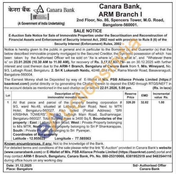 All that piece and parcel of the property bearing corporation # 9/3, ward No.48, situated at Lalbagh Main Road, Next to MTR Hotel, Bengaluru-560027. Also called (Postal Address) "SRI KRISHNA TOWERS". No 9/3, Lalbagh Main Road, Sudhamnagar, Bengaluru-560027. Total Building Area is 3400 Sq.ft. Boundaries of the property: East: Lalbagh Main Road, West: Private Property belonging to M/s MTR, North: Private property belonging to Sri P Shankarappas, South: Private Property belonging to Sri Pyarejan