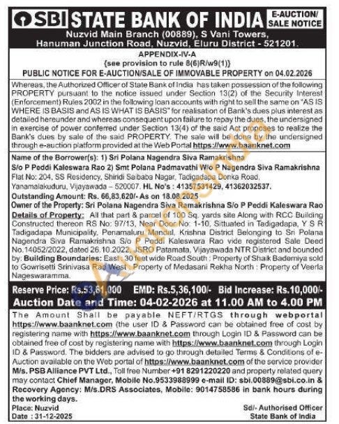 Details of Property: All that part & parcel of 100 Sq. yards site Along with RCC Building Constructed thereon RS No: 97/13, Near Door No: 1-10, Sittuated in Tadigadapa, YSR Tadigadapa Municipality, Penamaluru Mandal, Krishna District Belonging to Sri Polana Nagendra Siva Ramakrishna Sio P Peddi Kaleswara Rao vide registered Sale Deed No. 14052/2022, dated 26.10.2022, JSRO Patamata, Vijayawada NTR District and bounded by: Building Boundaries: East: 30 feet wide Road South Property of Shaik Bademiya sold to Gowrisetti Srinivasa Rap West: Property of Medasani Rekha North: Property of Veerla Nageswaramma.