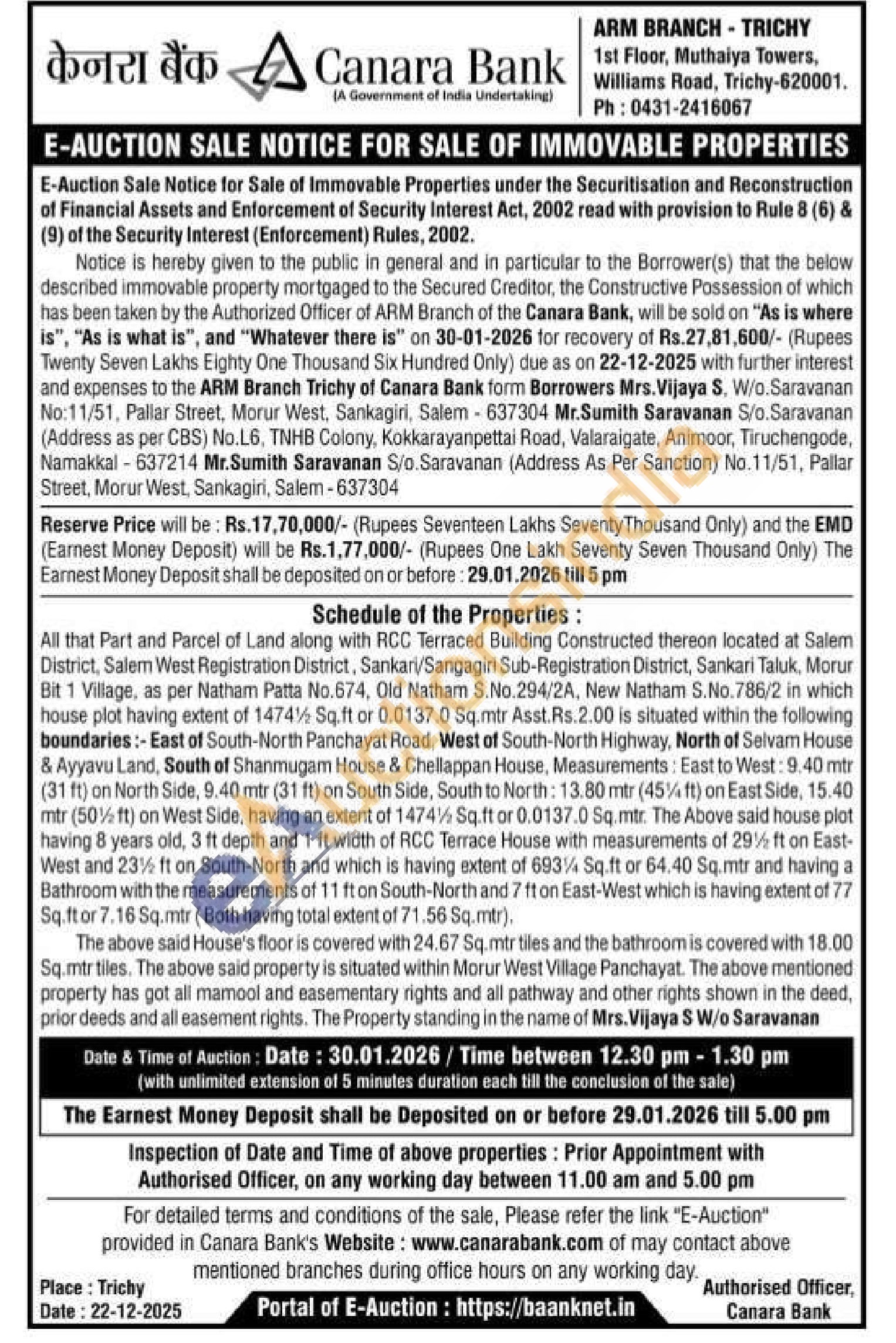All that Part and Parcel of Land along with RCC Terraced Building Constructed thereon located at Salem District, Salem West Registration District, Sankari/Sangagiri Sub-Registration District, Sankari Taluk, Morur Bit 1 Village, as per Natham Patta No.674, Old Natham S.No. 294/2A, New Natham S.No.786/2 in which house plot having extent of 1474% Sq.ft or 0.0137.0 Sq.mtr Asst.Rs.2.00 is situated within the following boundaries:- East of South-North Panchayat Road, West of South-North Highway, North of Selvam House & Ayyavu Land, South of Shanmugam House & Chellappan House, Measurements: East to West: 9.40 mtr (31 ft) on North Side, 9.40 mtr (31 ft) on South Side, South to North: 13.80 mtr (45% ft) on East Side, 15.40 mtr (50% ft) on West Side, having an extent of 1474% Sq.ft or 0.0137.0 Sq.mtr. The Above said house plot having 8 years old, 3 ft depth and 1 ft width of RCC Terrace House with measurements of 29% ft on East-West and 23% ft on South-North and which is having extent of 693% Sq.ft or 64.40 Sq.mtr and having a Bathroom with the measurements of 11 ft on South-North and 7 ft on East-West which is having extent of 77 Sq.ftor 7.16 Sq.mtr (Both having total extent of 71.56 Sq.mtr).