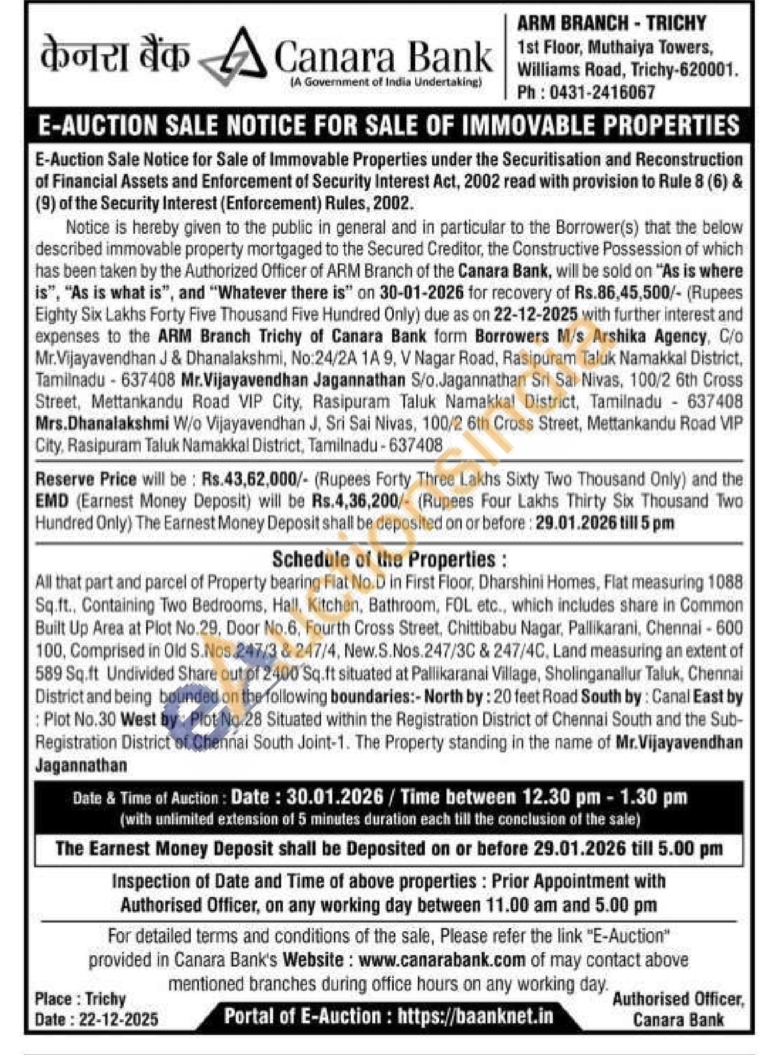 All that part and parcel of Property bearing Flat No.D in First Floor, Dharshini Homes, Flat measuring 1088 Sq.ft., Containing Two Bedrooms, Hall, Kitchen, Bathroom, FOL. etc., which includes share in Common Built Up Area at Plot No.29, Door No.6, Fourth Cross Street, Chittibabu Nagar, Pallikarani, Chennai - 600 100, Comprised in Old S.Nos.247/3 & 247/4, New. S.Nos. 247/30 & 247/4C. Land measuring an extent of 589 Sq.ft Undivided Share out of 2400 Sq.ft situated at Pallikaranai Village, Sholinganallur Taluk, Chennai District and being bounded on the following boundaries:-North by: 20 feet Road South by: Canal East by : Plot No.30 West by: Plot No.28 Situated within the Registration District of Chennai South and the Sub-Registration District of Chennai South Joint-1. The Property standing in the name of Mr.Vijayavendhan Jagannathan
