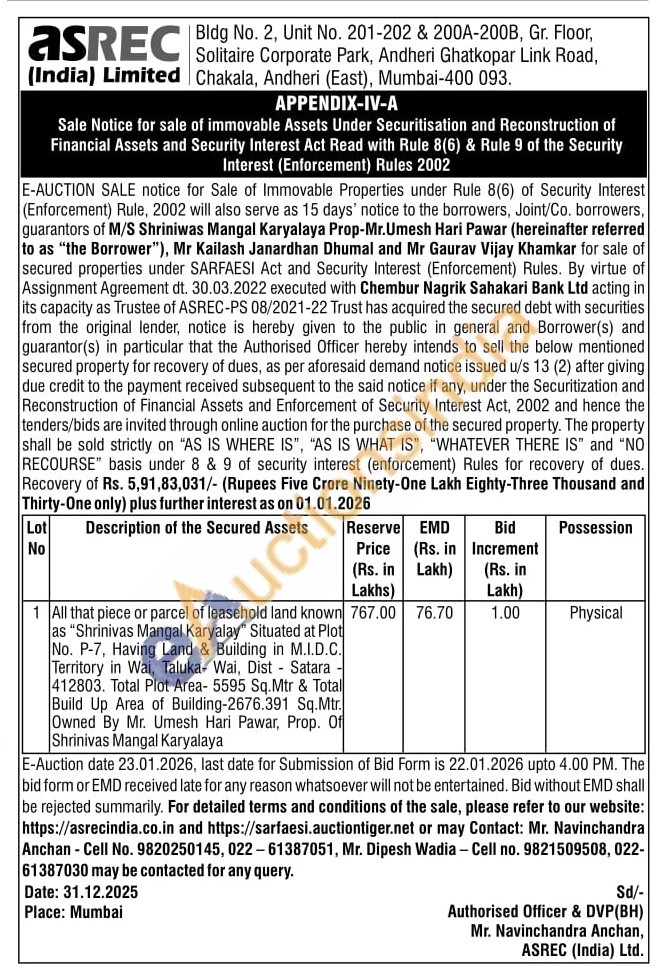 1 Situated at Plot No. P-7, Having Land & Building in M.I.D.C. Territory in Wai, Taluka- Wai, Dist - Satara 412803. Total Plot Area-5595 Sq.Mtr & Total Build Up Area of Building-2676.391 Sq.Mtr. Owned By Mr. Umesh Hari Pawar, Prop. Of Shrinivas Mangal Karyalaya