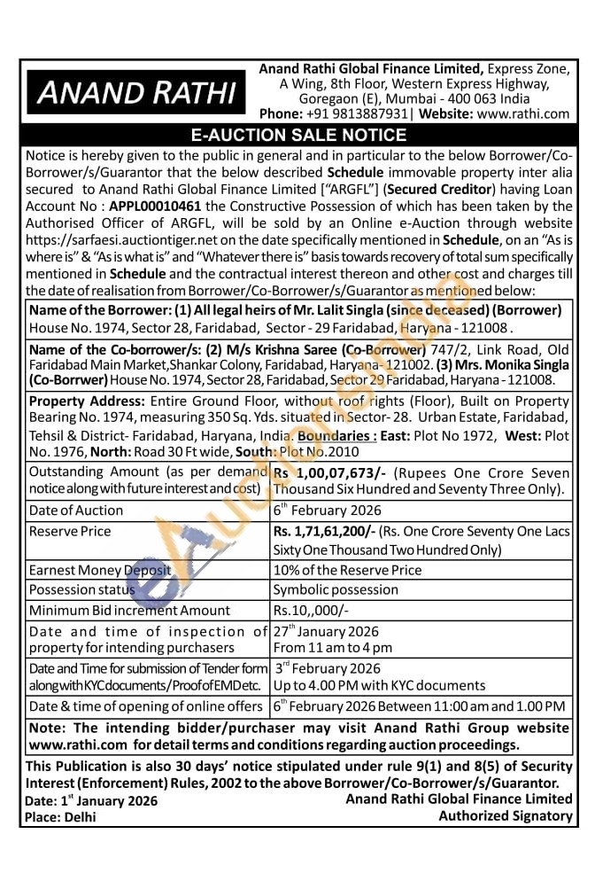 Property Address: Entire Ground Floor, without roof rights (Floor), Built on Property Bearing No. 1974, measuring 350 Sq. Yds. situated in Sector-28. Urban Estate, Faridabad, Tehsil & District- Faridabad, Haryana, India. Boundaries: East: Plot No 1972, West: Plot No. 1976, North: Road 30 Ft wide, South: Plot No.2010