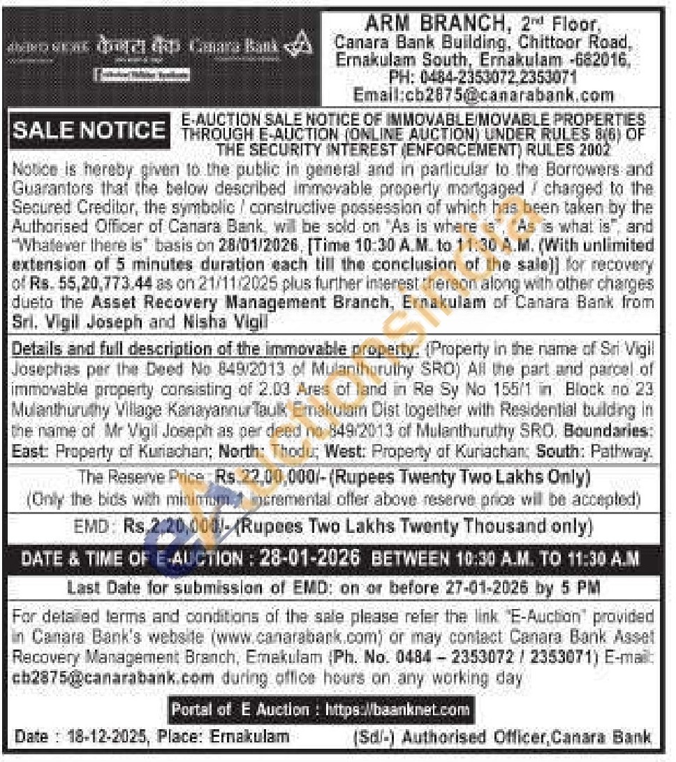 Details and full description of the immovable property: (Property in the name of Sri Vigil Josephas per the Deed No 849/2013 of Mulanthuruthy SRO) All the part and parcel of immovable property consisting of 2.03 Ares of land in Re Sy No 155/1 in Block no 23 Mulanthuruthy Village Kanayannur Taulk Ernakulam Dist together with Residential building in the name of Mr Vigil Joseph as per deed no 849/2013 of Mulanthuruthy SRO. Boundaries: East: Property of Kuriachan; North: Thodu; West: Property of Kuriachan; South: Pathway