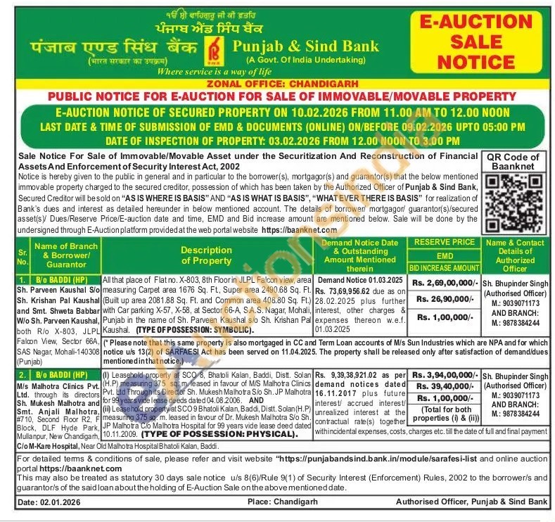 (1) Leasehold property at SCO 8, Bhatoli Kalan, Baddi, Distt. Solan (H.P) measuring 375 sq. m. leased in favour of M/S Malhotra Clinics Pvt. Ltd Through its Director Sh. Mukesh Malhotra S/o Sh. JP Malhotra for 99 years vide lease deeds dated 04.08.2006. AND(ii) Leasehold property at SCO 9 Bhatoli Kalan, Baddi, Distt. Solan (H.P) Fimeasuring 375 sq. m. leased in favour of Dr. Mukesh Malhotra S/o Sh. JP Malhotra C/o Malhotra Hospital for 99 years vide lease deed dated 10.11.2009. (TYPE OF POSSESSION: PHYSICAL).