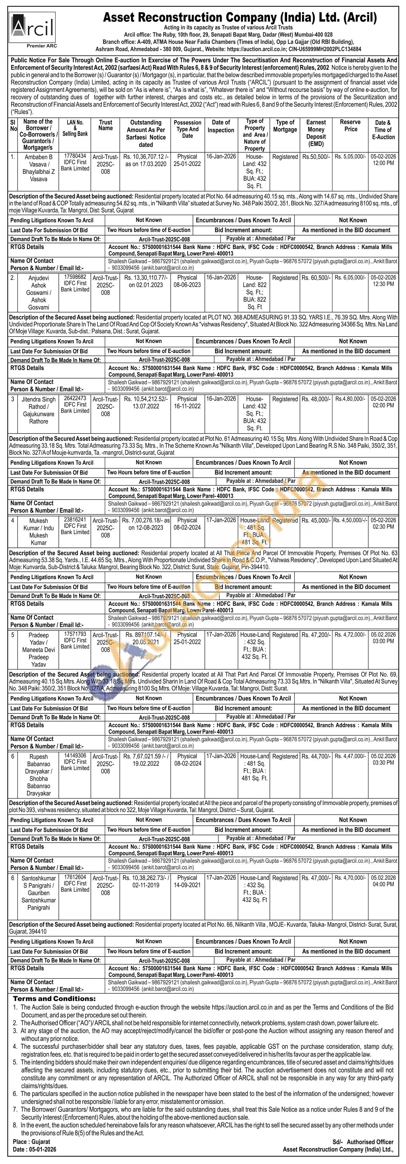 Description of the Secured Asset being auctioned: Residential property located at All That Piece And Parcel Of Immovable Property, Premises Of Plot No. 63 Admeasuring 53.38 Sq. Yards., I.E. 44.65 Sq. Mtrs., Along With Proportionate Undivided Share In Road & C.O.P., "Vishwas Residency", Developed Upon Land Situated At Moje: Kunvarda, Sub-District & Taluka: Mangrol, Bearing Block No. 322, District: Surat, State: Gujarat, Pin-394410