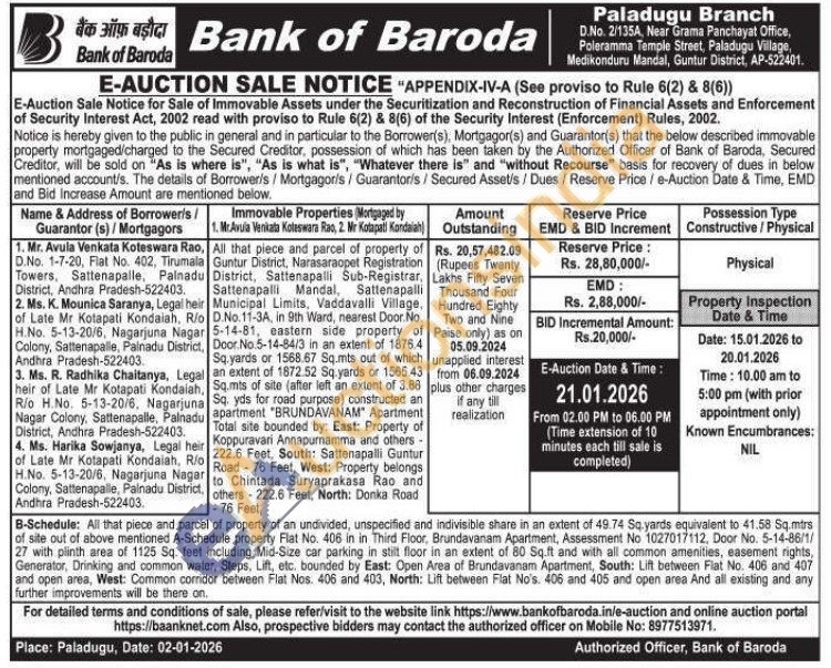 B-Schedule: All that piece and parcel of property of an undivided, unspecified and indivisible share in an extent of 49.74 Sq yards equivalent to 41.58 Sq.mtrs of site out of above mentioned A-Schedule property Flat No. 406 in in Third Floor, Brundavanam Apartment, Assessment No 1027017112, Door No. 5-14-86/1/27 with plinth area of 1125 Sq. feet including Mid-Size car parking in stilt floor in an extent of 80 Sq.ft and with all common amenities, easement rights, Generator, Drinking and common water, Steps, Lift, etc. bounded by East: Open Area of Brundavanam Apartment, South: Lift between Fiat No. 406 and 407 and open area, West: Common corridor between Flat Nos. 406 and 403, North: Lift between Flat No's. 406 and 405 and open area And all existing and any further improvements will be there on