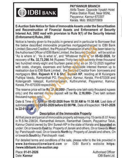 All that piece and parcel of immovable property admeasuring 15 cents (6.07 Ares) in R.S.No.238/24, Ramanthali Amsom, Ramanthali Desom, Payyannur Taluk, Kannur District owned by Shri Suresh KP in the state of Kerala and bounded as under: On or towards East by: Property of Janaki and others, On or towards West by: Panchayath road, On or towards North by: Property of Janaki and others, On or towards South by: Panchayath road.