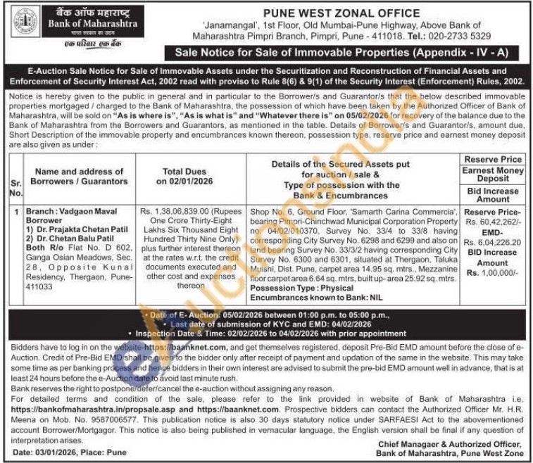 Shop No. 6, Ground Floor, 'Samarth Carina Commercia', bearing Pimpri-Chinchwad Municipal Corporation Property по. 04/02/010370, Survey No. 33/4 to 33/8 having corresponding City Survey No. 6298 and 6299 and also on land bearing Survey No. 33/3/2 having corresponding City Survey No. 6300 and 6301, situated at Thergaon, Taluka Mulshi, Dist. Pune, carpet area 14.95 sq. mtrs.. Mezzanine floor carpet area 6.64 sq. mtrs, built up-area 25.92 sq. mirs