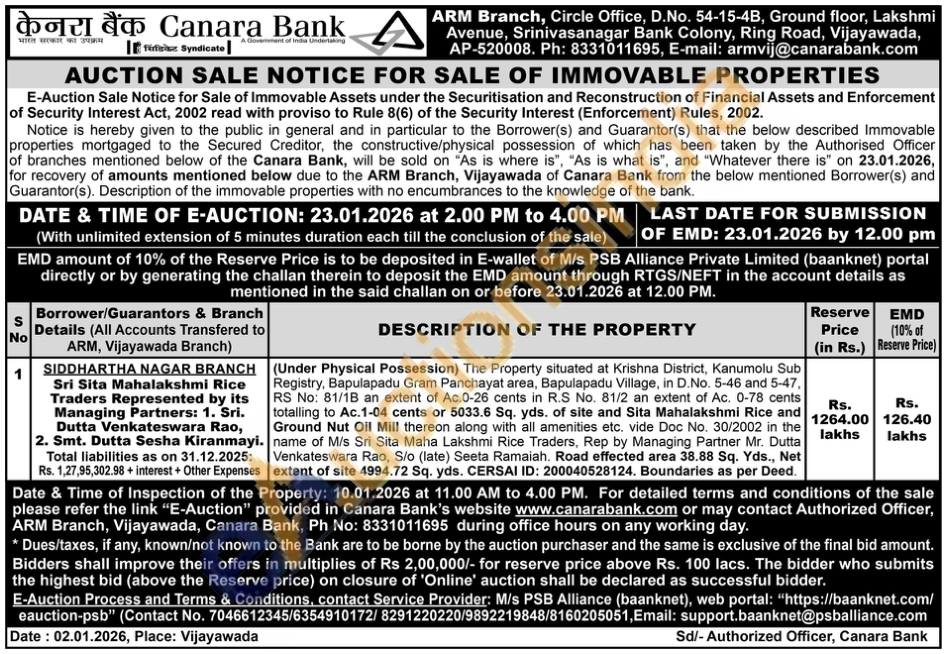(Under Physical Possession) The Property situated at Krishna District, Kanumolu Sub Registry, Bapulapadu Gram Panchayat area, Bapulapadu Village, in D.No. 5-46 and 5-47, RS No: 81/1B an extent of Ac.0-26 cents in R.S No. 81/2 an extent of Ac. 0-78 cents totalling to Ac.1-04 cents or 5033.6 Sq. yds. of site and Sita Mahalakshmi Rice and Ground Nut Oil Mill thereon along with all amenities etc. vide Doc No. 30/2002 in the name of M/s Sri Sita Maha Lakshmi Rice Traders, Rep by Managing Partner Mr. Dutta Venkateswara Rao, S/o (late) Seeta Ramaiah. Road effected area 38.88 Sq. Yds., Net extent of site 4994.72 Sq. yds. CERSAI ID: 200040528124. Boundaries as per Deed