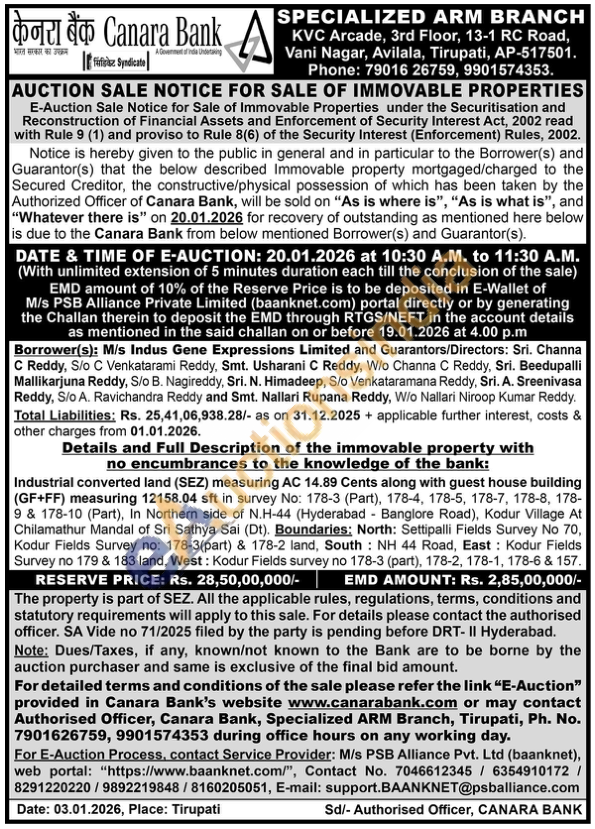 Details and Full Description of the immovable property with no encumbrances to the knowledge of the bank: Industrial converted land (SEZ) measuring AC 14.89 Cents along with guest house building (GF+FF) measuring 12158.04 sft in survey No: 178-3 (Part), 178-4, 178-5, 178-7, 178-8, 178-9 & 178-10 (Part), In Northern side of N.H-44 (Hyderabad Banglore Road), Kodur Village At Chilamathur Mandal of Sri Sathya Sai (Dt). Boundaries: North: Settipalli Fields Survey No 70, Kodur Fields Survey no: 178-3(part) & 178-2 land, South NH 44 Road, East: Kodur Fields Survey no 179 & 183 land, West: Kodur Fields survey no 178-3 (part), 178-2, 178-1, 178-6 & 157