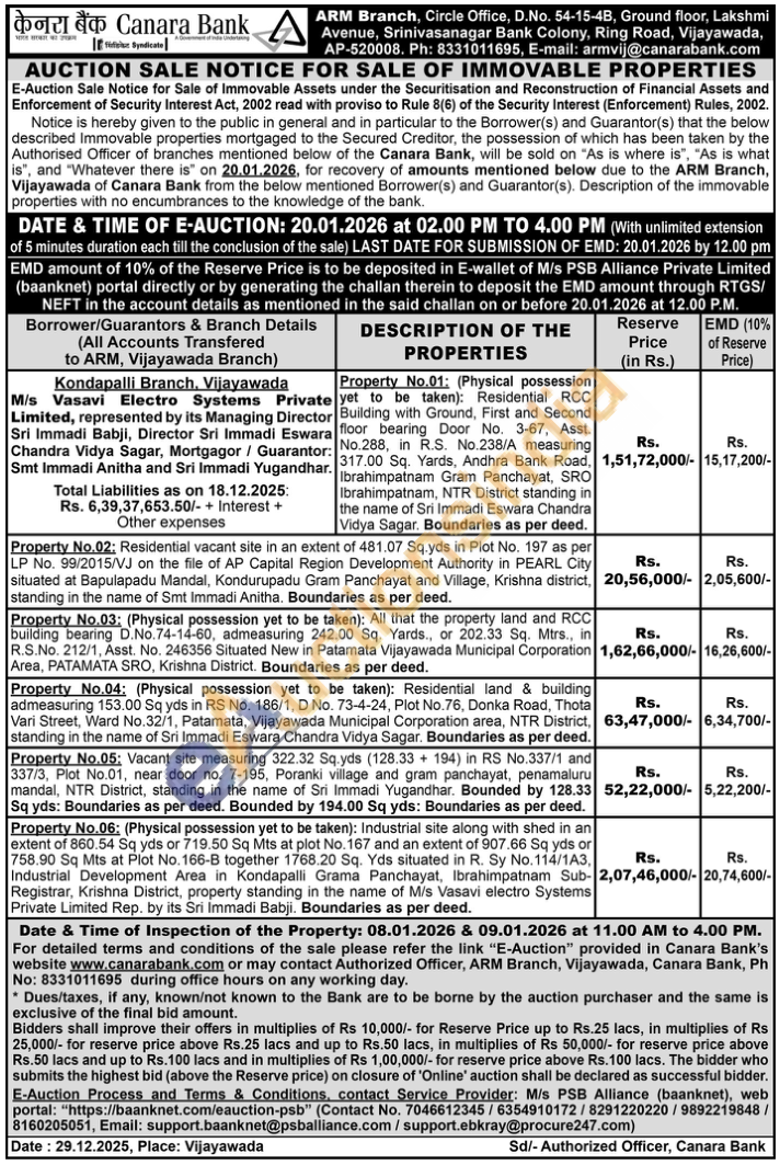 Property No.06: (Physical possession yet to be taken): Industrial site along with shed in an extent of 860.54 Sq yds or 719.50 Sq Mts at plot No. 167 and an extent of 907.66 Sq yds or 758.90 Sq Mts at Plot No. 166-B together 1768.20 Sq. Yds situated in R. Sy No.114/1A3, Industrial Development Area in Kondapalli Grama Panchayat, Ibrahimpatnam Sub-Registrar, Krishna District, property standing in the name of M/s Vasavi electro Systems Private Limited Rep. by its Sri Immadi Babji. Boundaries as per deed