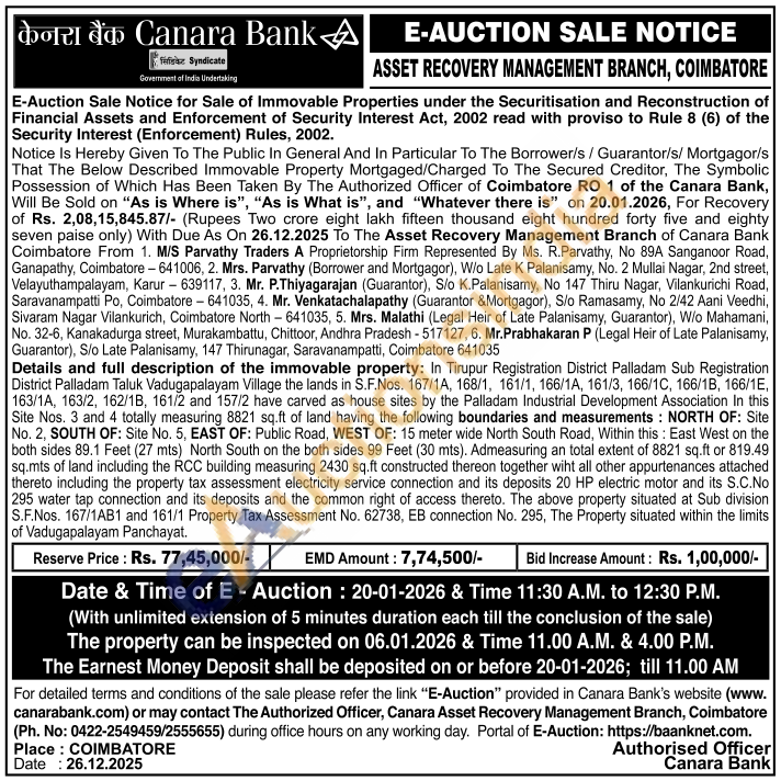 Details and full description of the immovable property: In Tirupur Registration District Palladam Sub Registration District Palladam Taluk Vadugapalayam Village the lands in S.F.Nos. 167/1A, 168/1, 161/1, 166/1A, 161/3, 166/1C, 166/1B, 166/1E, 163/1A, 163/2, 162/1B, 161/2 and 157/2 have carved as house sites by the Palladam Industrial Development Association In this Site Nos. 3 and 4 totally measuring 8821 sq.ft of land having the following boundaries and measurements: NORTH OF: Site No. 2, SOUTH OF: Site No. 5, EAST OF: Public Road, WEST OF: 15 meter wide North South Road, Within this: East West on the both sides 89.1 Feet (27 mts) North South on the both sides 99 Feet (30 mts). Admeasuring an total extent of 8821 sq.ft or 819.49 sq.mts of land including the RCC building measuring 2430 sq.ft constructed thereon together wiht all other appurtenances attached thereto including the property tax assessment electricity service connection and its deposits 20 HP electric motor and its S.C.No 295 water tap connection and its deposits and the common right of access thereto. The above property situated at Sub division S.F.Nos. 167/1AB1 and 161/1 Property Tax Assessment No. 62738, EB connection No. 295, The Property situated within the limits of Vadugapalayam Panchayat