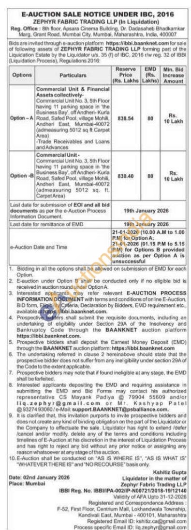 Commercial Unit & Financial Assets collectively Option-A Commercial Unit No. 3, 5th Floor having 11 parking space in the Business Bay, off Andheri Kurla Road, Safed Pool, village Mohili, Andheri East, Mumbai-40072 (admeasuring 5012 sq ft Carpet Area) Trade Receivables and Loans and Advances
