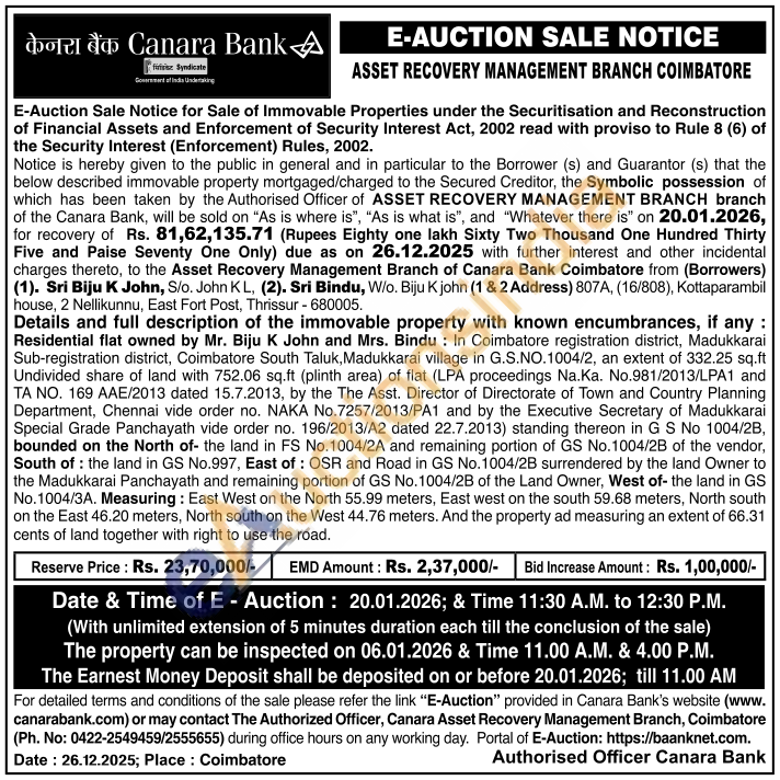 Details and full description of the immovable property with known encumbrances, if any: Residential flat owned by Mr. Biju K John and Mrs. Bindu: In Coimbatore registration district, Madukkarai Sub-registration district, Coimbatore South Taluk, Madukkarai village in G.S.NO.1004/2, an extent of 332.25 sq.ft Undivided share of land with 752.06 sq.ft (plinth area) of flat (LPA proceedings Na.Ka. No.981/2013/LPA1 and ΤΑ ΝΟ. 169 AAE/2013 dated 15.7.2013, by the The Asst. Director of Directorate of Town and Country Planning Department, Chennai vide order no. NAKA No.7257/2013/PA1 and by the Executive Secretary of Madukkarai Special Grade Panchayath vide order no. 196/2013/A2 dated 22.7.2013) standing thereon in G S No 1004/2B, bounded on the North of the land in FS No.1004/2A and remaining portion of GS No.1004/2B of the vendor, South of the land in GS No.997, East of: OSR and Road in GS No.1004/2B surrendered by the land Owner to the Madukkarai Panchayath and remaining portion of GS No. 1004/2B of the Land Owner, West of- the land in GS No.1004/3A. Measuring: East West on the North 55.99 meters, East west on the south 59.68 meters, North south on the East 46.20 meters, North south on the West 44.76 meters. And the property ad measuring an extent of 66.31 cents of land together with right to use the road