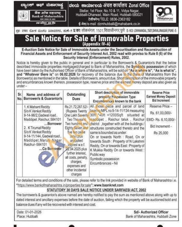 All those piece and parcel of land bearing MPL no 9-14-11/134 measuring 30ft 40ft 1200Sqft situated at maddipet, Raichur taluk, Raichur district, together with all the buildings/structures constructed thereto and the same is bounded as under On or towards North Road, On or towards South Property of N Lakshmi Reddy, On or towards East: Property of K Mukka Reddy On or towards West: Public way