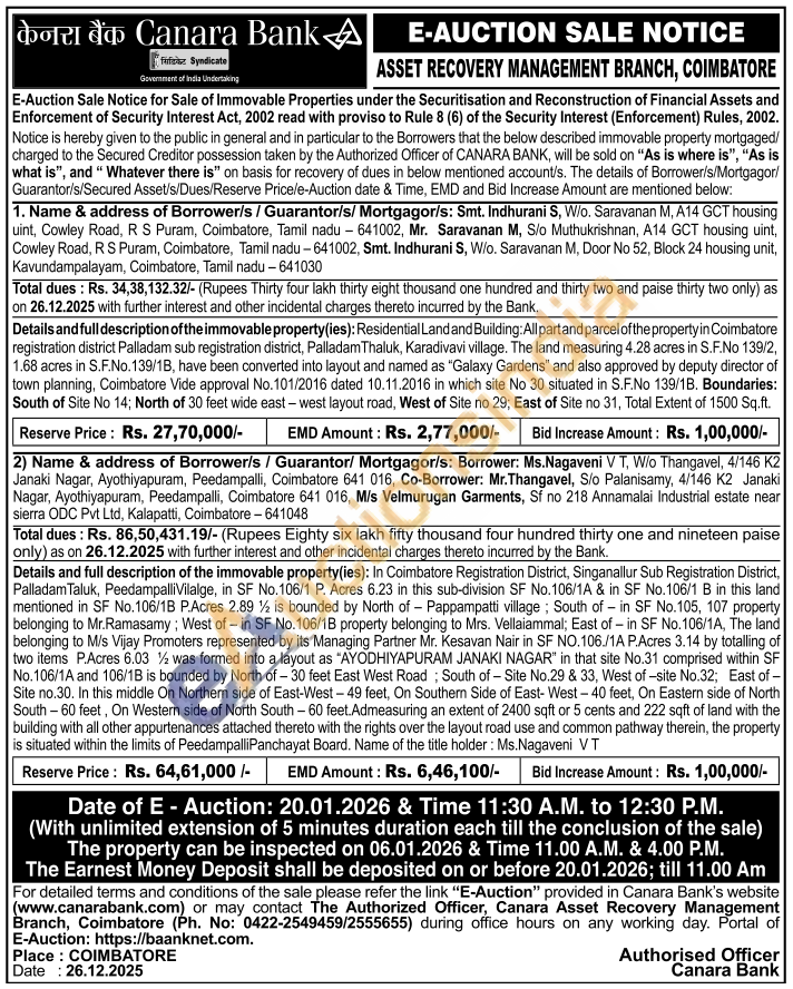 Details and full description of the immovable property (ies): Residential Land and Building: All part and parcel of the property in Coimbatore registration district Palladam sub registration district, Palladam Thaluk, Karadivavi village. The land measuring 4.28 acres in S.F.No 139/2, 1.68 acres in S.F.No. 139/1B, have been converted into layout and named as "Galaxy Gardens" and also approved by deputy director of town planning, Coimbatore Vide approval No. 101/2016 dated 10.11.2016 in which site No 30 situated in S.F.No 139/1B. Boundaries: South of Site No 14; North of 30 feet wide east-west layout road, West of Site no 29; East of Site no 31, Total Extent of 1500 Sq.ft