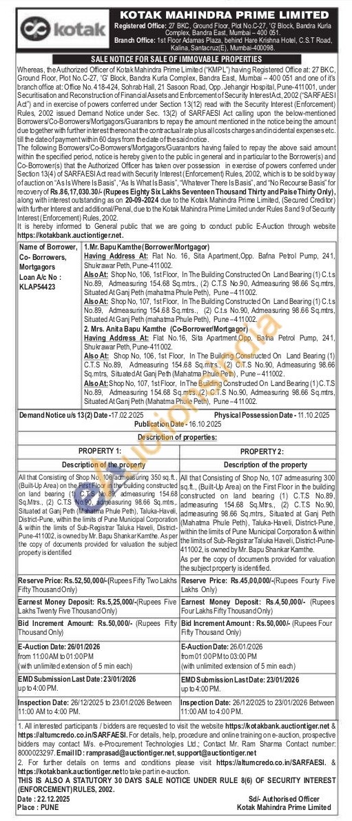 All that Consisting of Shop No, 107 admeasuring 300 sq.ft., (Built-Up Area) on the First Floor in the building constructed on land bearing (1) C.T.S No.89. admeasuring 154.68 Sq.Mtrs., (2) C.T.S No.90, admeasuring 98.66 Sq.mtrs, Situated at Ganj Peth (Mahatma Phule Peth), Taluka-Haveli, District-Pune, within the limits of Pune Municipal Corporation & within the limits of Sub-Registrar Taluka Haveli, District-Pune-411002, is owned by Mr. Bapu Shankar Kamthe.As per the copy of documents provided for valuation the subject property is identified.