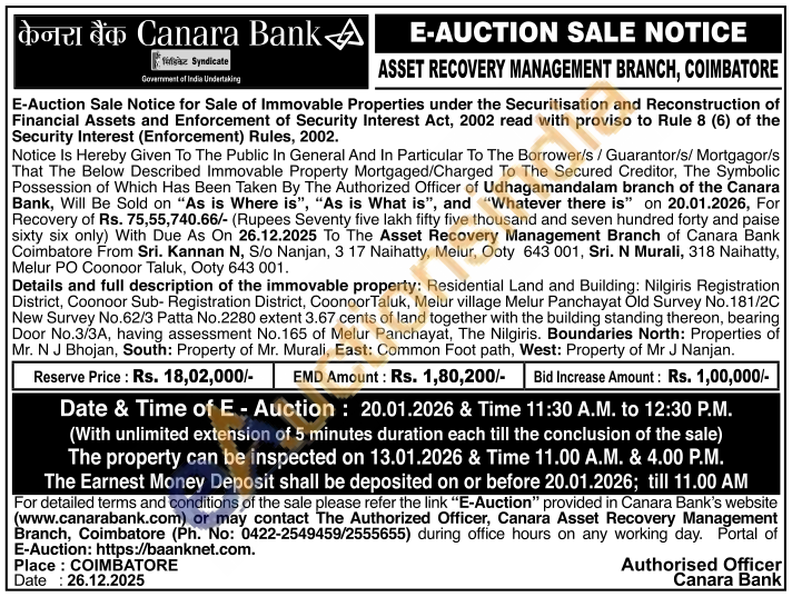 Details and full description of the immovable property: Residential Land and Building: Nilgiris Registration District, Coonoor Sub- Registration District, Coonoor Taluk, Melur village Melur Panchayat Old Survey No.181/2C New Survey No.62/3 Patta No.2280 extent 3.67 cents of land together with the building standing thereon, bearing Door No.3/3A, having assessment No.165 of Melur Panchayat, The Nilgiris. Boundaries North: Properties of Mr. N J Bhojan, South: Property of Mr. Murali, East: Common Foot path, West: Property of Mr J Nanjan