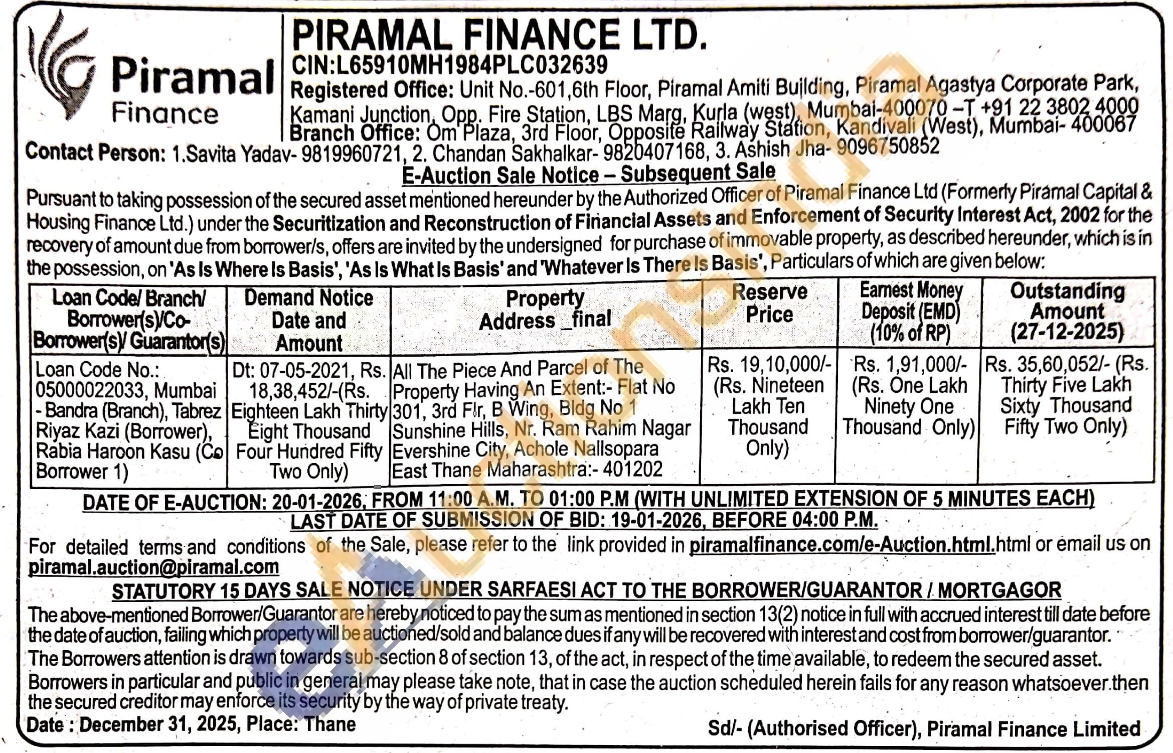 All The Piece And Parcel of The Property Having An Extent:- Flat No 301, 3rd Flr, B Wing, Bldg No 1 Sunshine Hills, Nr. Ram Rahim Nagar Evershine City, Achole Nallsopara East Thane Maharashtra:- 401202