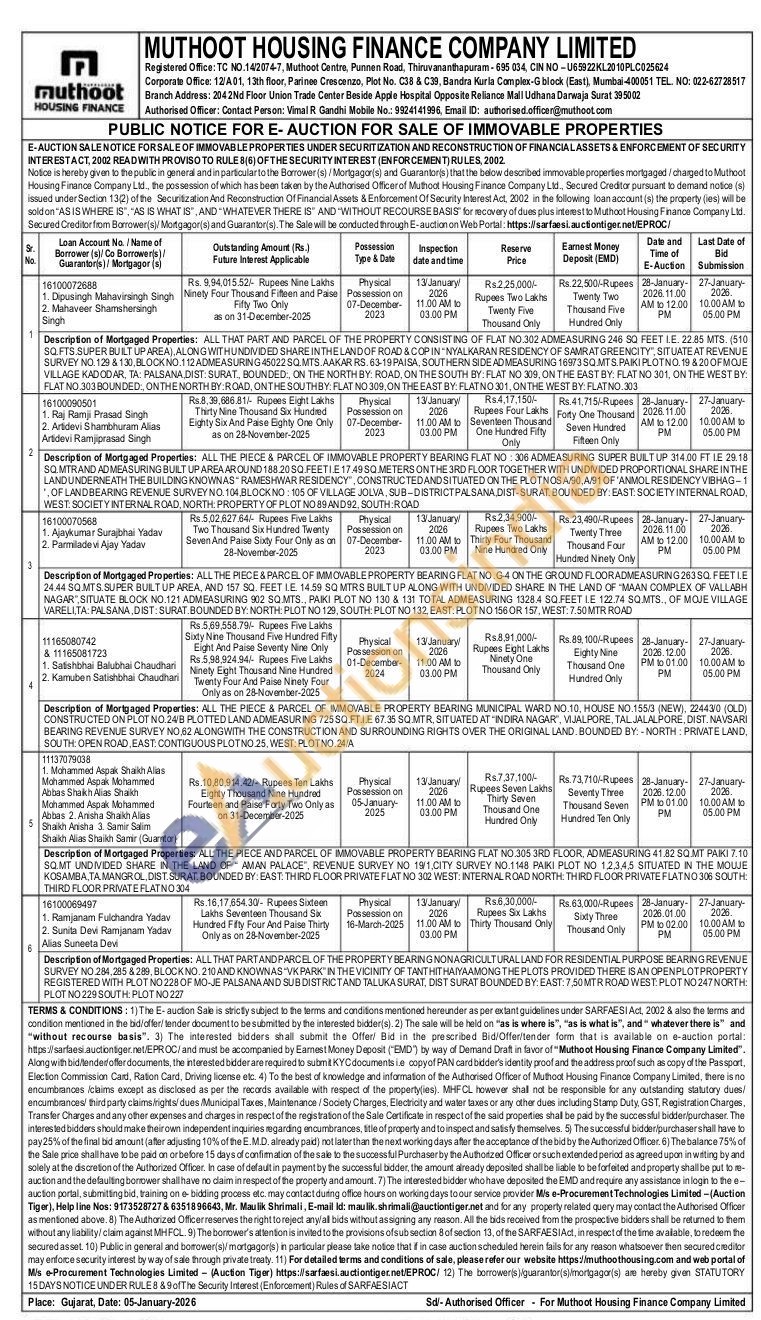 Description of Mortgaged Properties: ALL THE PIECE & PARCEL OF IMMOVABLE PROPERTY BEARING MUNICIPAL WARD NO.10, HOUSE NO.155/3 (NEW), 22443/0 (OLD) CONSTRUCTED ON PLOT NO.24/B PLOTTED LAND ADMEASURING 725 SQ.FT.LE 67.35 SQ.MTR, SITUATED AT INDIRA NAGAR", VIJALPORE, TALJALALPORE, DIST. NAVSARI BEARING REVENUE SURVEY NO.62 ALONG WITH THE CONSTRUCTION AND SURROUNDING RIGHTS OVER THE ORIGINAL LAND BOUNDED BY: NORTH: PRIVATE LAND, SOUTH, OPEN ROAD, EAST, CONTIGUOUS PLOTNO 25, WEST: PLOT NO.24/A