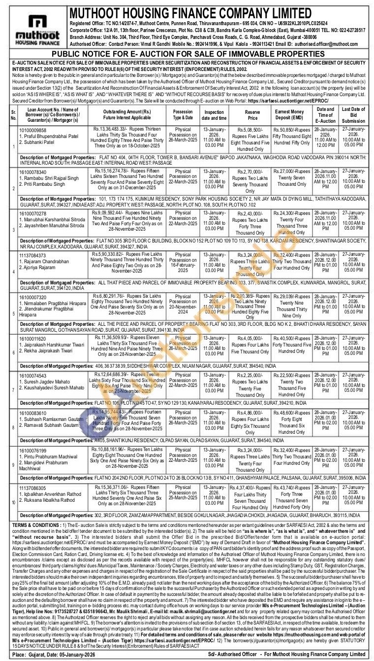 Description of Mortgaged Properties: A405, SHANT IKUNJ RESIDENCY, OLPAD SAYAN, OLPAD SAYAN, GUJARAT, SURAT, 394540, INDIA