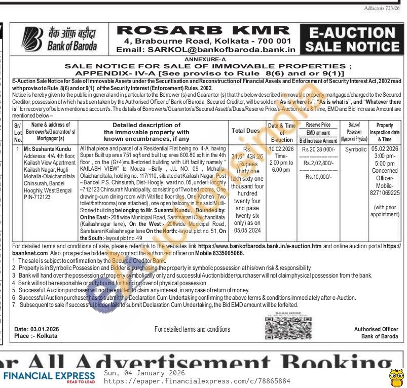 All that piece and parcel of a Residential Flat being no. 4-A, having Super Built up area 751 sqft and built up area 600.80 sqft in the 4th floor, on the (G+4)multi-storied building with Lift facility namely " KAILASH VIEW to Mouza Bally, J.L NO. 09, Mohalla Olaichanditala, holding no. 117/110, situated at Kailash Nagar, Post -Bandel, P.S. Chinsurah, Dist-Hoogly, ward no. 05, under Hooghly -712123 Chinsurah Municipality, consisting of Two bed rooms, One drawing-cum dining room with Vitrified floor tiles, One Kitchen, Two toilet/bathrooms(one attached), one open balcony in the said Mutli-Storied building belonging to Mr. Susanta Kundu, Bounded by: On the East:-20ft wide Municipal Road, Saratsarani Olaichanditala (Kailashnagar lane), On the West: 20ftwide Municipal Road, SaratsaraniKailashnagar lane On the North:-layout plot no. 51, On the South:-layout plotno. 49