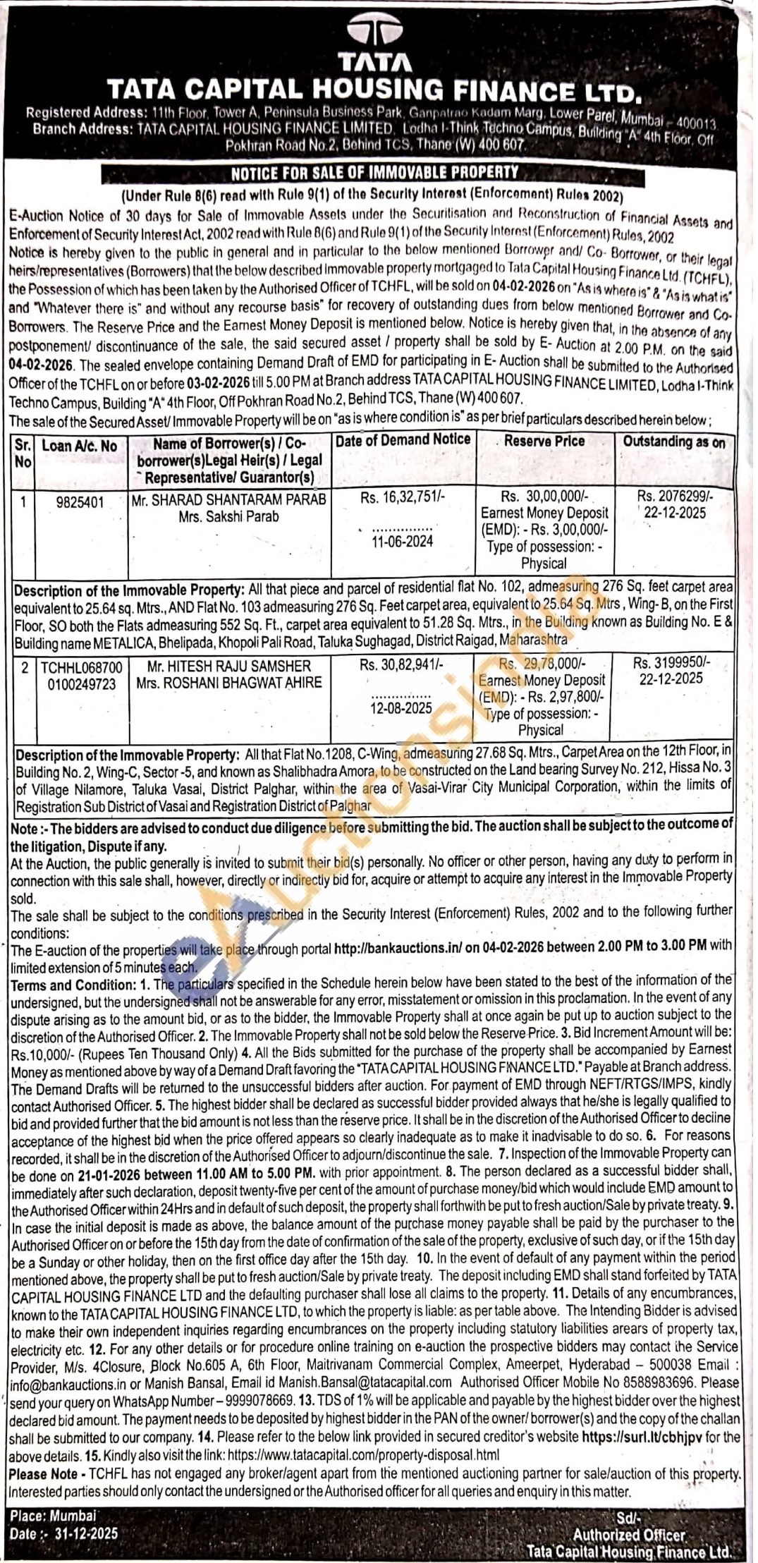 Description of the Immovable Property: All that Flat No. 1208, C-Wing, admeasuring 27.68 Sq. Mtrs., Carpet Area on the 12th Floor, in Building No. 2, Wing-C, Sector-5, and known as Shalibhadra Amora, to be constructed on the Land bearing Survey No. 212, Hissa No. 3 of Village Nilamore, Taluka Vasai, District Palghar, within the area of Vasai-Virar City Municipal Corporation, within the limits of Registration Sub District of Vasai and Registration District of Palghar