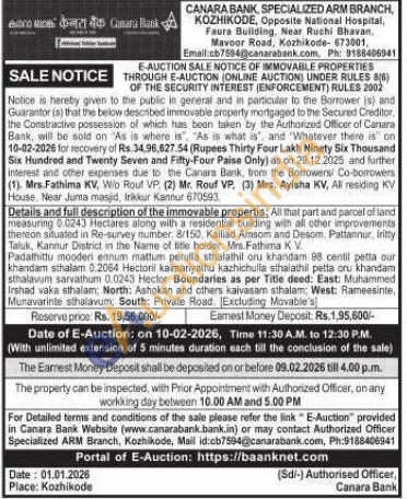 Details and full description of the immovable propertis: All that part and parcel of land measuring 0.0243 Hectares along with a residential building with all other improvements thereon situated in Re-survey number. 8/150, Kalliad Amsom and Desom, Pattannur, Iritty Taluk, Kannur District in the Name of title holder. Mrs. Fathima KV Padathittu mooderi ennum mattum perulla sthalathil oru khandam 98 centil petta our khandam sthalam 0.2064 Hectoril kaimariyathu kazhichulla sthalathil petta oru khandam sthalavum sarvathum 0.0243 Hector. Boundaries as per Title deed: East: Muhammed Irshad vaka sthalam: North: Ashokan and others kaivasam sthalam; West: Rameesinte, Munavatinte silhalavum, South: Private Road Excluding Movable's