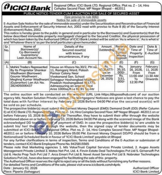 House on Khasra No.30/2, PH no. 11, Ramganj Ward, Palash Parisar Colony Near Vivekanand Sen. School Sohagpur Hoshangbad Madhya Pradesh Hoshangabad 461771 Admeasuring an area of Total Area 1000sq.ft ie 92.91 Sq mtr
