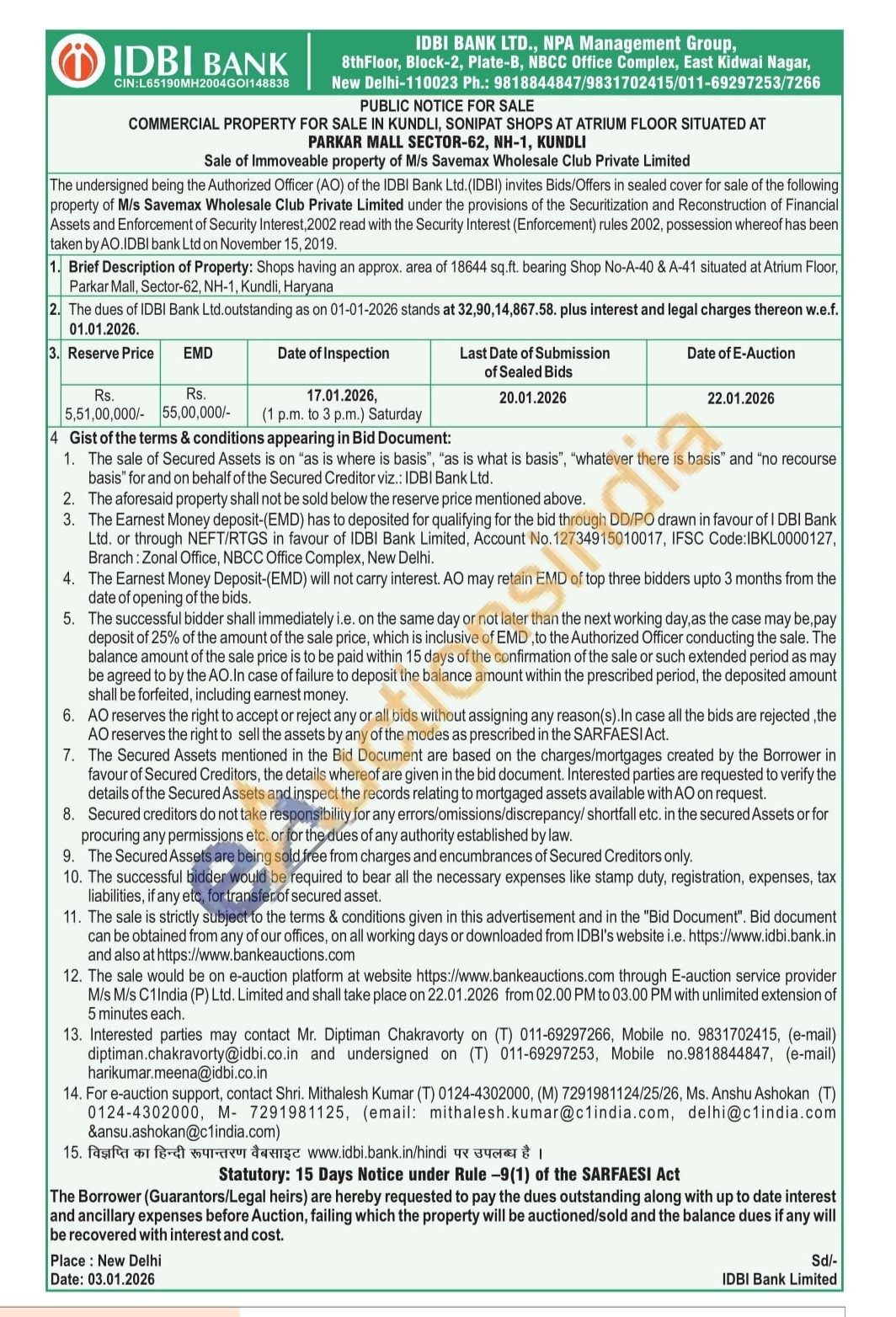 Brief Description of Property: Shops having an approx. area of 18644 sq.ft. bearing Shop No-A-40 & A-41 situated at Atrium Floor, Parkar Mall, Sector-62, NH-1, Kundli, Haryana