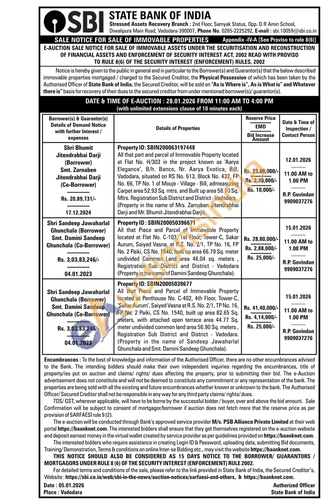 All that Piece and Parcel of Immovable Property located at Penthouse No. C-402, 4th Floor, Tower-C, 'Sakar Aurum', Saiyed Vasna at R.S. No. 2/1, TP No. 16, FP No. 2 Paiki, CS No. 1540, built up area 82.65 Sq. meters, with attached open terrace area 44.77 Sq. meter undivided common land area 56.90 Sq. meters, Registration Sub District and District Vadodara. (Property in the name of Sandeep Jawaharlal Ghunchala and Smt. Damini Sandeep Ghunchala