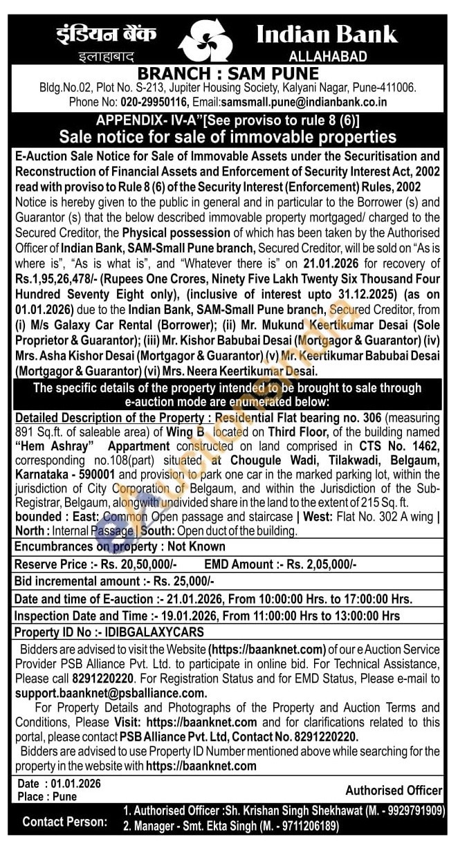 Detailed Description of the Property: Residential Flat bearing no. 306 (measuring 891 Sq.ft. of saleable area) of Wing B located on Third Floor, of the building named "Hem Ashray" Appartment constructed on land comprised in CTS No. 1462, corresponding no.108(part) situated at Chougule Wadi, Tilakwadi, Belgaum, Karnataka-590001 and provision to park one car in the marked parking lot, within the jurisdiction of City Corporation of Belgaum, and within the Jurisdiction of the Sub-Registrar, Belgaum, alongwith undivided share in the land to the extent of 215 Sq. ft. bounded: East: Common Open passage and staircase | West: Flat No. 302 A wing | North: Internal Passage | South: Open duct of the building.