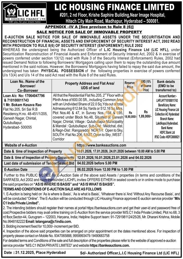 All that the Residential Flat No.205, 2nd Floor with a Plinth Area of 600.00 Sft., including Common Area with an Undivided Share of 22.0 Sq. Yds out of total Admeasuring 612.64 Sq. Yards or 512.16 Sq.Mtrs. Plot Nos.46 & 47, in Survey Nos. 194 & 195, covered under Block No.48, Situated at Ganesh Nagar, Chintal, Village: Qutubullapur Municipality & Mandal: Qutubullapur, Sub-Dist: Medchal, dist. & Regn-Dist: Rangareddy NORTH: Open to Sky, SOUTH : Flat No.206, EAST: Open to Sky, WEST: Corridor