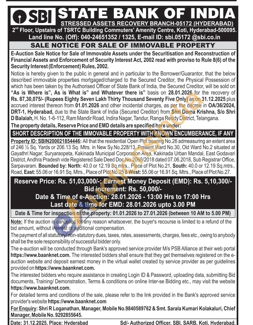 Property ID: SBIN200021854446: All that the residential Open Plot bearing No.26 admeasuring an extent area of 246 ½ Sq. Yards or 206.13 Sq. Mtrs. in New Sy.No.228/13, Present Ward No.30, Old Ward No.2 situated at Gayathri Nagar, Suryaraopeta, Kakinada Municipal Corporation Area, Kakinada Urban Mandal, East Godavari District, Andhra Pradesh vide Registered Sale Deed Doc. No.2066/2018 dated 07.06.2018, Sub Registrar Office, Sarpavaram. Bounded by: North: 40.0 or 12.19 Sq.mtrs., Place of Plot No.21, South: 40.0 or 12.19 Sq.mtrs., Road, East: 55.06 or 16.91 Sq. Mtrs., Place of Plot No.25 & West: 55.06 or 16.91 Sq. Mtrs., Place of Plot No.27.