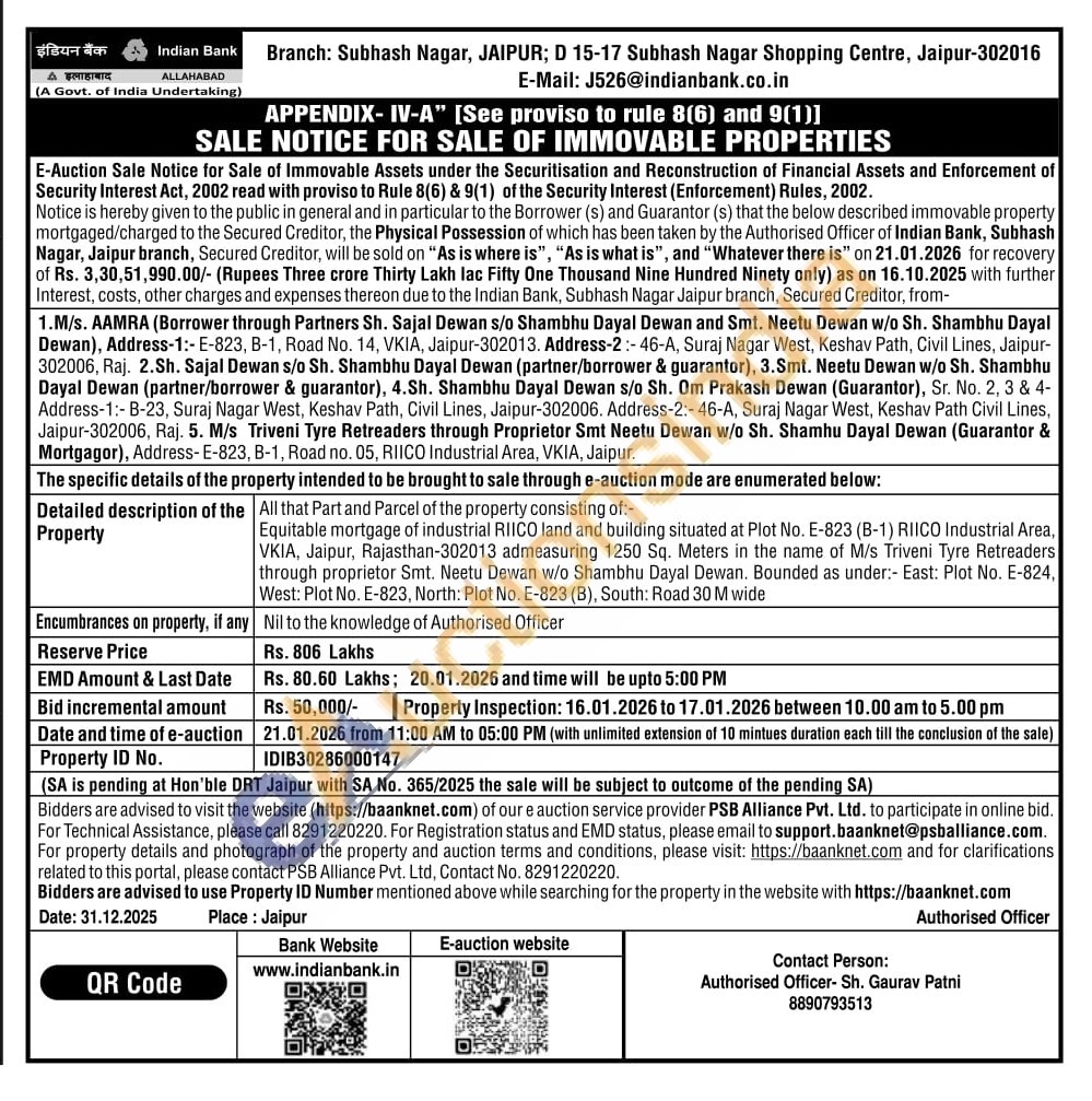 All that Part and Parcel of the property consisting of:- Equitable mortgage of industrial RIICO land and building situated at Plot No. E-823 (B-1) RIICO Industrial Area, VKIA, Jaipur, Rajasthan-302013 admeasuring 1250 Sq. Meters in the name of M/s Triveni Tyre Retreaders through proprietor Smt. Neetu Dewan w/o Shambhu Dayal Dewan. Bounded as under:- East: Plot No. E-824, West: Plot No. E-823, North: Plot No. E-823 (B), South: Road 30 M wide