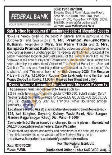 LG 55-inch Television, Hitachi Projector CP EX 250, Sofa 3-seater, Sofa 4-Seater, Sofa 2-Seater, Cool Pride Air Cooler, LG GL U292JPOL 260 Ltr., LG 343 Ltr. Refrigerator (2 Star) GL 478YSX4, other Household articles, Utensils, Cloths etc. Location (Secured Asset) at which the above-mentioned item stored-695, Aai Banglow, Dnyanraj Colony, Wada Road, Near Sangam Garden, Rajgurunagar (Khed), Dist. Pune-410505.