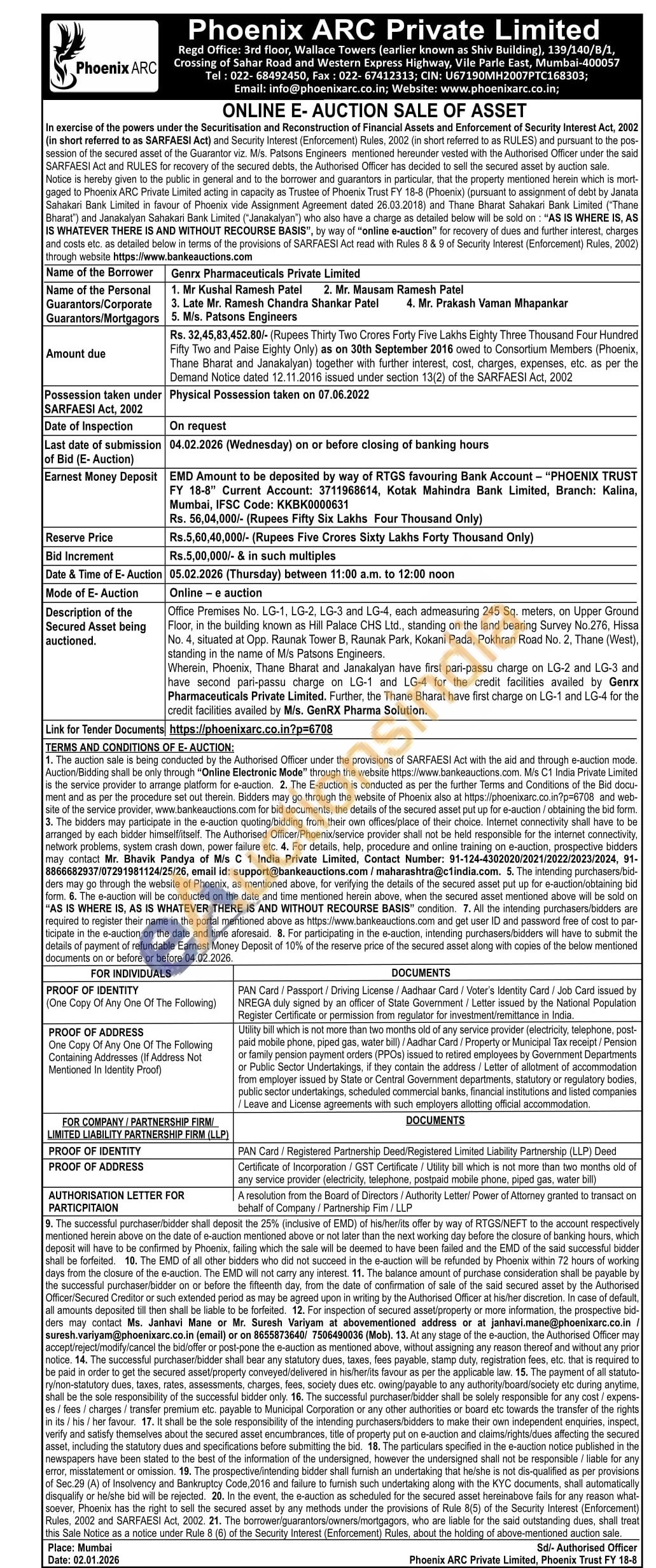 Office Premises No. LG-1, LG-2, LG-3 and LG-4, each admeasuring 246 Sq. meters, on Upper Ground Floot in the building kroven as Hii Palace CHS Lid standing on the land bearing Survey No.276, Hissa No. 4, stuated at Opp. Rautar Tower B. Raunak Park, Kokary Parcia Pokhon Road No. 2. Thane (West) standing in the name of Mis Pat In the name of Mis Patsons Engineers Wherein Phoenox Thane Bharat arc Janakayat have finst pari-passu charge on LG-2 and LG-3 and have second pari-passs charge on LG-1 and LG-4 for the credit facilites availed by Genrx Pharmaceuticals Private Limited. Further, the Thane Bharat have fest charge on LG-1 and LG-4 for the credit facilities availed by Ms. GanRX Pharma Solution.
