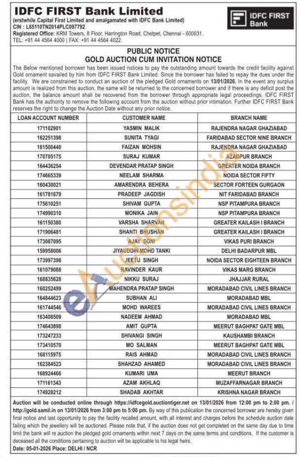 IDFC First Bank Ltd Gold Auctions Auction in Ghaziabad