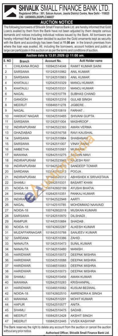 Shivalik Small Finance Bank Ltd Gold Auctions Auction in Ghaziabad