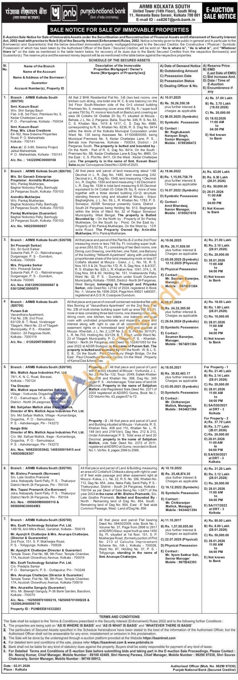 All that 2 BHK Residential Flat No. 3-B (two bed rooms, one kitchen cum dining, one toilet one W. C. & one balcony) on the 3rd Floor South-Westem side of the G+3 storied building Premises No. 5, measuring cover area 495 Sq. ft. / super built up area 750 Sq. Ft. more or less built on Bastu Land covering an area 06 Cottahs 04 Chattak 20 Sq. Ft. situated at Mouza -Behala, J.L. No. 2, Pargana-Balia, Touzi No. 346, R. S. No. 83, C. S. Khatian Nos. 1415 & 1417, C. S. Dag No. 6986, corresponding to R. S. Khatian No. 6236, R. S. Dag No. 8414 within the limits of the Kolkata Municipal Corporation under Ward No. 130 being Assessee No. 411300800055, being Municipal Premises No. 5. Kedar Chatterjee Lane, P. S. -Behala now Parnasree, Kolkata 700034, District 24 Parganas South. The property is butted and bounded by On the North Part of R. S. Dag No. 8414, On the South: Premises No. 5B, Kedar Chatterjee Lane & Dag No. 6985, On the East: C. S. Plot No. 8411, On the West: Kedar Chatterjee Lane. The property is in the name of Smt. Kusum Bauri Saha as per Conveyance Deed No 1-3249 of 2023.