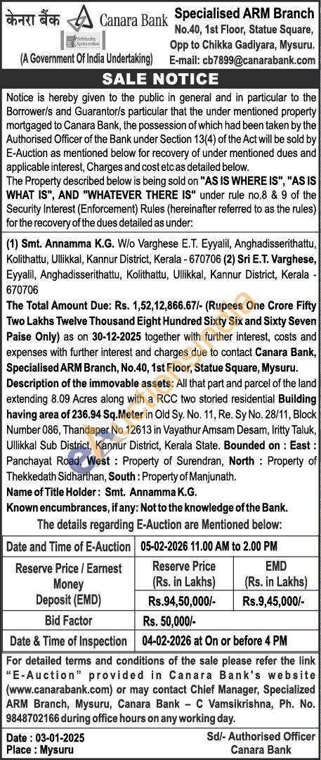 Description of the immovable assets: All that part and parcel of the land extending 8.09 Acres along with a RCC two storied residential Building having area of 236.94 Sq.Meter in Old Sy. No. 11, Re. Sy No. 28/11, Block Number 086, Thandaper No 12613 in Vayathur Amsam Desam, Iritty Taluk, Ullikkal Sub District, Kannur District, Kerala State. Bounded on: East: Panchayat Road, West: Property of Surendran, North: Property of Thekkedath Sidharthan, South: Property of Manjunath. Name of Title Holder: Smt. Annamma K.G.