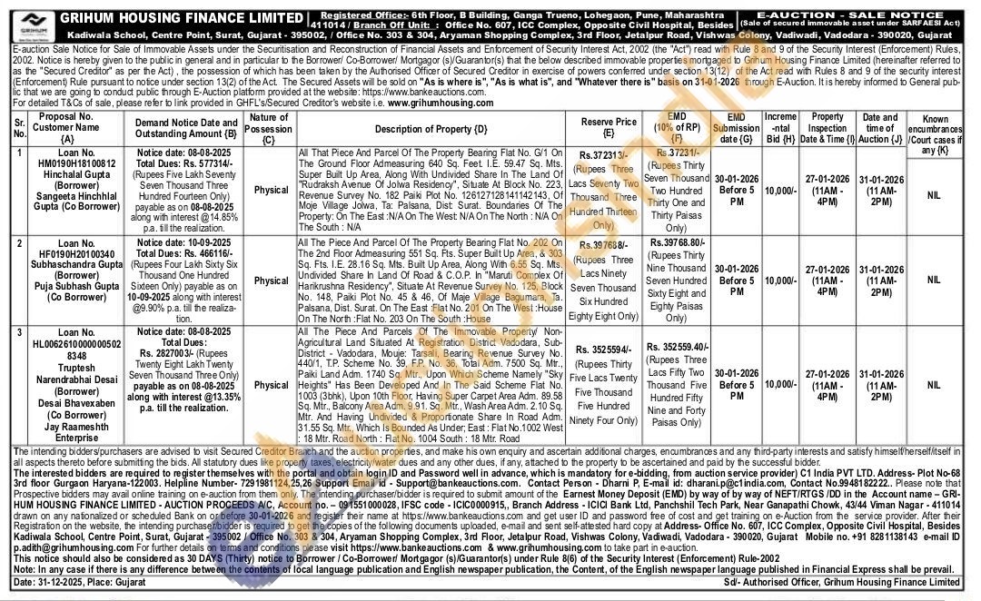 1) All That Piece And Parcel Of The Property Bearing Flat No. G/1 On Floor Admeasuring 640 Sq. Feet 1.E. 59.47 Sq. Mts. The Ground ordening Undivided Share In The Land Of "Rudraksh Avenue Of Jolwa Residency", Situate At Block No. 223, Revenue Survey No. 182 Paiki Plot No. 126127128141142143, Of Moje Village Jolwa, Ta: Palsana, Dist Surat. Boundaries Of The Property: On The East: N/A On The West: N/A On The North: N/A On The South: N/A