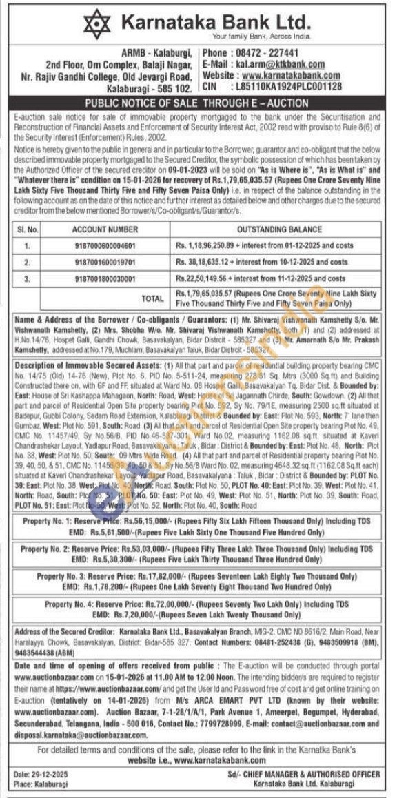 (3) All that part and parcel of Residential Open Site property bearing Plot No. 49. CMC No. 11457/49. Sy No.56/8, PID No. 46-537-301, Ward No.02, measuring 1162.08 sqft, situated at Kaveri Chandrashekar Layout, Yadlapur Road, Basavakalyana: Taluk, Bidar: District & Bounded by: East: Plot No. 48, North: Plot No. 38. West: Pict No. 50, South: 09 Mtrs Wide Road.